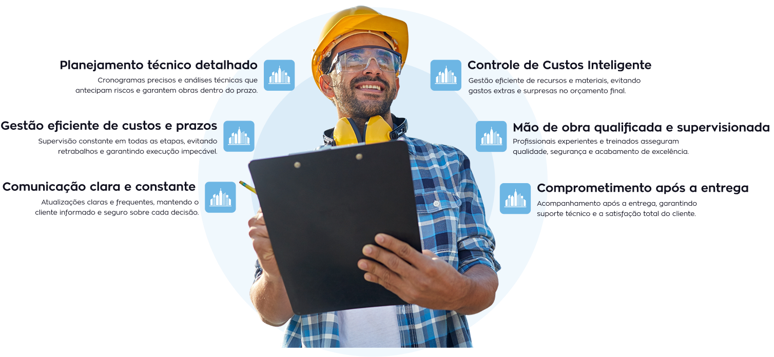 Priorizamos planejamento e transparência para que cada obra siga seu cronograma com segurança e previsibilidade.